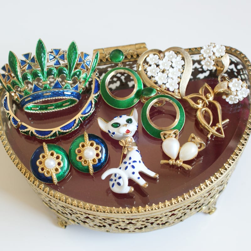 | 商品の特徴 | TRIFARIクラウントリファリ ホワイト パール 勿忘草 ハート ブローチ。TRIFARIクラウントリファリ ホワイト パール 勿忘草 ハート ブローチ。TRIFARIクラウントリファリ アップル りんご ミニブローチ。クラウントリファリのブローチです。いお様 リクエスト 6点 まとめ商品。多少の傷や塗装剥がれありますので、ヴィンテージ品にご理解の上ご購入よろしくお願いいたします。トリファリ TRIFARI クラウン 王冠 ブローチ トリファリ TRIFARI。爽やかな色使いと立体的なデザイン、まじまじと眺めたくなる素晴らしいデザインです。中央のブルーのパーツの下にはバネついていて触るとブルブルと動きます。♥美品♥シャネル ココマーク クリスタル ブローチ。デヴィッドアンデルセン 青い鳥 ブローチ。※値下げ不可◯サイ画像にてご確認ください | ||