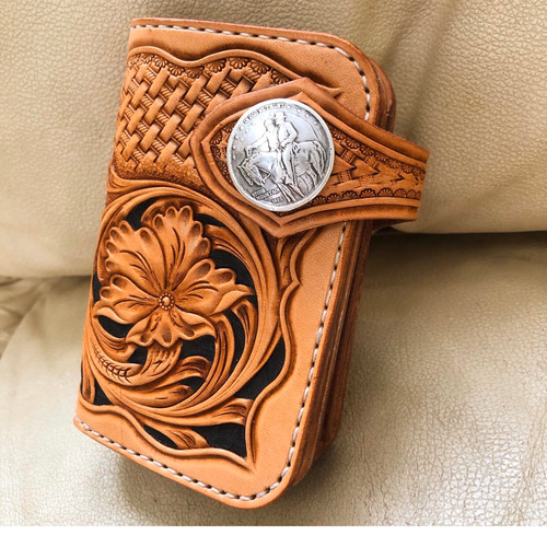 | 商品の特徴 | カービングウォレット ミドルウォレット レザーウォレット 2つ折り財布。レザーウォレット、革小物専門店【レザークラフト優】。カービングウォレット ミドルウォレット レザーウォレット 2つ折り財布。【カービングミドルウォレット 二つ折り財布】全面にシェリダン図柄を彫り込んだ二つ折りミドルサイズの財布になりますカードポケットは3枚と背面に3〜4枚分の収納スペースあり。二つ折り財布/カービングウォレット/バイカーズウォレット/ライダース。札入れとフラップ型の小銭入れのベーシックな内装になりますズボンポケットにジャストで入るサイズ感です。☆トラッカーウォレット イタリアテンペスティ社(テキサス)。ハンドルドロップやウォレットチェーンを追加料金にて付ける事も可能ですので必要な場合はご相談ください\"仕様\"ハーマンオーク社ツーリングレザー栃木ワイルドレザー__________________カービングに使用する革は全てハーマンオーク社のツーリングレザーを使用しています最高品質の米国原産ステアハイドの原皮を使用し、良質なタンニンで長時間かけて生産される最高級のヌメ革は、古くからカウボーイの愛用する鞍(くら)にも使用され、仕上がりが堅めな点からカービングに適し経年による色艶が良く高級な革材となっておりますその他、厳選した国産ヌメ革や輸入革を使用して作品を制作しております花と蔦をモチーフにしたシェリダンスタイルはアメリカ由来の昔からある伝統的な技法になります作品の全てのデザインは私のオリジナルで描きあげた物になり、常に修正・制作を繰り返して今現在のデザインとなっています独自の染色技法で色味を出し仕上げていますデザインから仕立てまで全て手作業の為、非常に手間がかかり量産は出来ませんお手に取っていただいた時にハンドメイドの良さを実感できる物作りを目指しています・天然牛革を素材として使用していますので自然な傷シワ等がある可能性がございます・色落ち、衣類等への色移りの可能性がございます。プラダ二つ折り財布。取り扱いにご注意ください・写真撮影には最善を尽くしておりますが、環境や色具合により実際の商品と若干異なる場合がございます・メンテナンス、修理。【ルイヴィトン】 ジッピーウォレット M42616 モノグラム。その他初期不良以外の返品は承れませんのでご容赦ください検索#ヌメ革#牛革#本革#革財布#バイカーズ#アメカジ#レザークラフト#ハンドメイド #シェリダンカービング#ロングウォレット#ワンオフ#サドルレザー#レザーカービング#レザーウォレット#レザーキーケース#ラウンドファスナー#カービングウォレット#革小物#pierrotCR | ||
